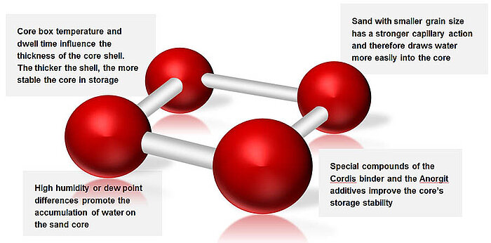 In addition to the selection of binders and additives, there are further parameters in foundry operation which can be used to influence the storage stability of the cores. An important factor is, for example, the thickness of the core shell: the thicker the shell, the more stable the core is in storage. The formation of the shell, which plays an important role in determining its final strength, can be specifically controlled via the temperature and the dwell time in the core box. The choice of the sand also has an impact on the storage stability. Sand with a smaller grain size has a higher capillary action and there-fore draws water more easily into the core.