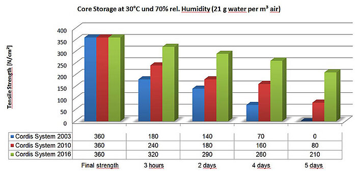 This means, that in the case of high humidity and high temperatures, curing is partially reversible; the cores may lose their strength and be easily destroyed. One way to pre-vent this is to use air-conditioned storage rooms which are adjusted to a humidity of 30-50%. However, these types of storage spaces are not always possible.