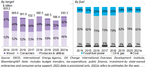 “The G-20 and G-7 governments have announced a range of seemingly more ambitious commitments to phase out fossil-fuel subsidies,” said Victoria Cuming, head of global policy at BloombergNEF and lead author of the factbook. “But they always seem to include imprecise language and caveats, giving governments wiggle room to interpret these pledges as they wish. BNEF’s analysis shows that there seems to be little evidence of those countries delivering on their promises.”