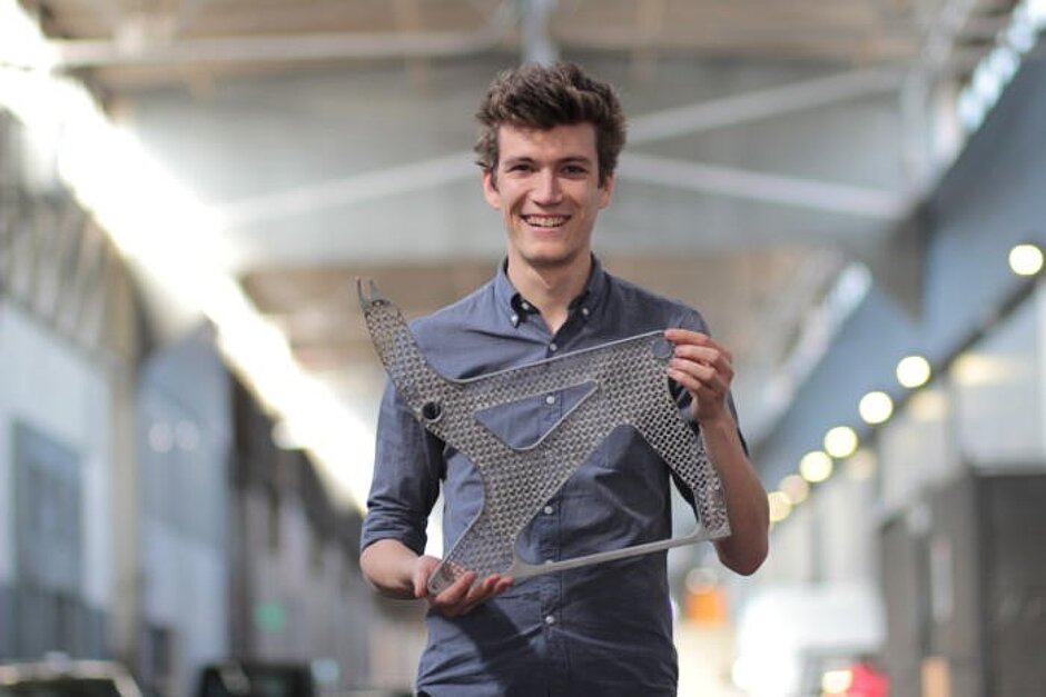 Autodesk researcher Andreas Bastian displays how lightweight the new seat frame is.