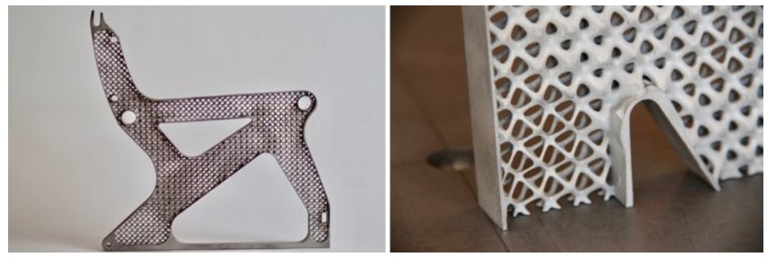 The magnesium seat frame created using a CAD program, a 3D printer and traditional metal casting techniques. On the right is the intricate latticework that resulted in a vastly lighter, yet strong seat frame.