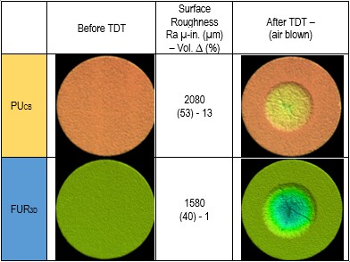 The profile scanning of the specimens before and after TDT are obtained, and typical pictorials given in Table 2. The table shows as well numerical information regarding the surface roughness and the volumetric change of the specimen. The change in volume is based on the scanned data, and the volumetric difference of the FUR3D specimen was the lower than the one for PUCB. The heat-affected zone in the specimens of sand with organic binders reveals unbonded sand where the binder had been completely pyrolyzed but remains intact because the specimen is undergoing compression against the hot surface at that location. However, cracks and fractures become evident after blowing away the loose grains of sand.