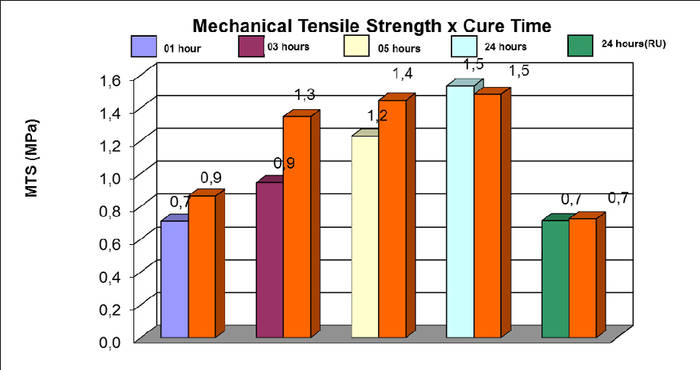 ![]() Figure 1. Behavior of the Mechanical Tensile Strength in accordance with the cure time for the specimens with VPU-compared to the phenol-urethane resin. (Orange bars on the right) |