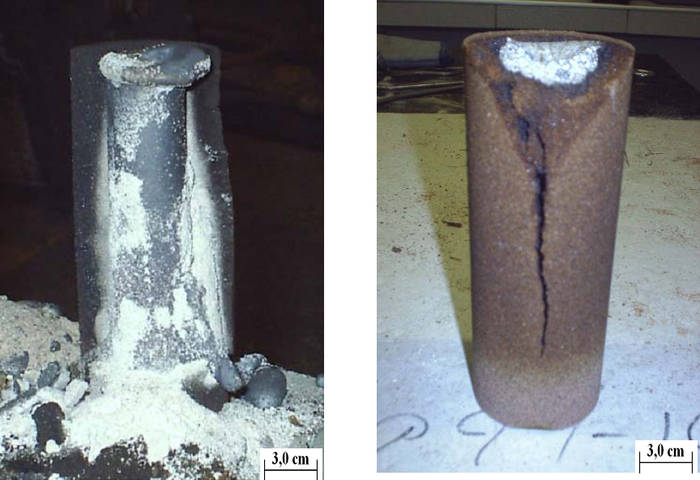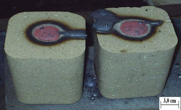 ![]() Figure 3 Digital image of the sand molds behavior using only VPU resin as binder after fusion in the laboratory of cast iron and aluminum left and right, respectively. |