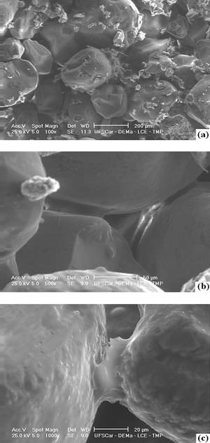 ![]() Figure 6 a) outer wall of the mold without undergoing the action of the molten metal temperature, b) Middle region of the mold wall temperature after undergoing the action of generating liquid phase, c) region of the inner wall of the mold (interface with the liquid metal ), indicating also the formation of liquid phase. |