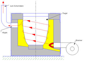 Figure 3 illustrates the principle of a gas-heated crucible furnace. Due to the lateral arrangement of the fume exhaust duct into the stack, the work place is virtually free from pollutants. The crucible is equipped with a swiveling cover to save energy during holding by minimizing heat loss due to radiation from the bath surface. Crucible furnaces with the fumes being exhausted above the rim of the crucible and a hood arranged above the crucible are hardly ever in use today. A drawback of this furnace design is that the fumes come in contact with the bath, affecting negatively the quality of the melt and causing a much higher pollutant load at the work place.