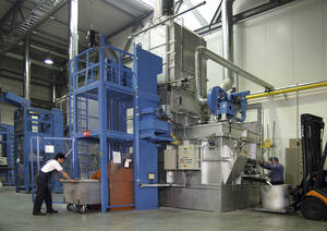 <link file:7506>![]() Figure 3 Schematic design of a gas-heated crucible furnace | <link file:7507>![]() Figure 4 Electric resistance heated tiltable crucible furnace, StrikoWestofen GmbH |
