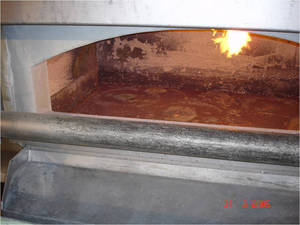 In principle chips can also be melted in induction crucible furnaces. Here the heavy, partly vertical, agitation of the bath has the effect that the chips easily submerge below the bath surface. This is an indispensible precondition for low melting loss. As an alternative option, gas-heated multi-chamber furnaces have been developed featuring a holding chamber with an additional furnace pocket (open fore-hearth) for adding the metal chips. Figure 13 shows a system equipped with a circulation pump and a dedicated refractory block for melting metal chips. The refractory block and pump form an integrated unit. The pump sucks the metal out of the holding chamber of the furnace and pumps it into the block (figure 14). The pump is fitted on a steel structure. This makes it easy for the personnel to lift it out of the bath for maintenance or cleaning. In the downstream block a vortex is created, which quickly draws the chips below the metal surface, melting them under exclusion of air - as known from submerged melting. The circulating metal leads to quick thermal and chemical homogenization of the melt. The continuous movement of the melt has the positive effects that the process of heating up the melt to the required temperature consumes less energy and the tapping temperature of the melt is characterized by high uniformity. This system achieves metal yields better than 98%. These values are based on comprehensive performance measurements performed at various chip melting furnaces. The form and properties of the chips – in this case mainly turnings - as well as the alloys were well suited for remelting. At the end of the melting campaign, the amount of surface dross in the bath chamber was very low (figure 15). This dross can be easily removed through the cleaning door. The residual metal is treated by drossing flux added in small quantities. This creates dross of relatively dry condition, which is removed via the furnace well.