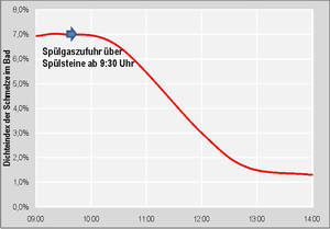 Figure 12 shows the curve of the density index of the melt in the holding bath of a two-chamber shaft melting furnace after start of inert gas injection via the purging plugs. After a period of deceleration the density index decreases continuously. With a low melt temperature of 700°C and very low contents of oxides and other solid contaminants an excellent final DI value below 1.5 % could be attained.