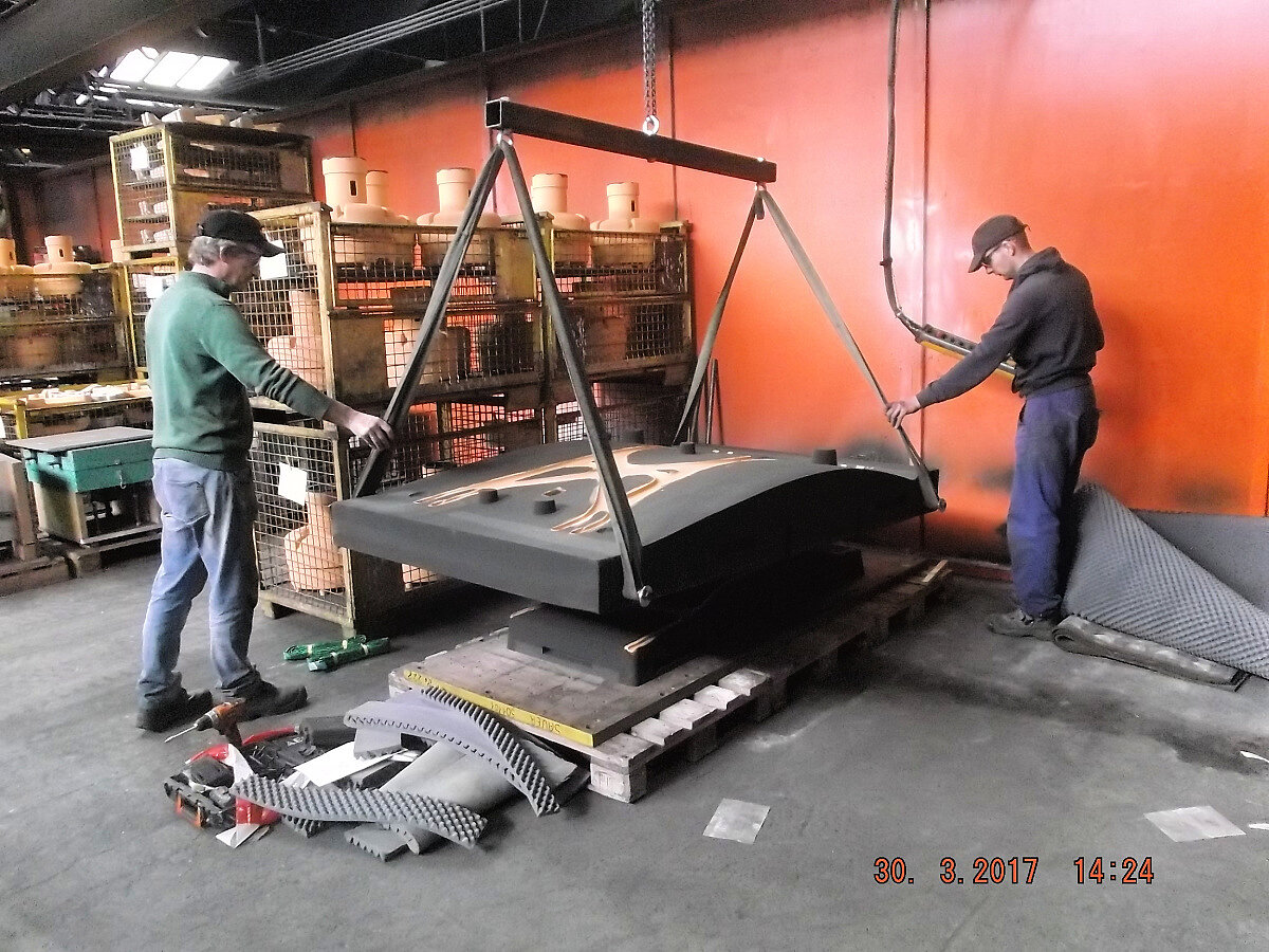 Once the printing procedure has finished, the workers remove the side walls of the construction platform that were printed with the component and remove any misprinted quartz sand. This leaves the casting mould, which can be used straight away. The foundry (Pro Cast Guss from Gütersloh) gives the casting mould just one coating – the barrier layer between sand and metal, which protects the casting mould from thermal stress. Despite all of this, the shape is lost after the casting – just as with traditional casting moulds (sand-casting moulds). It is destroyed after the core of the cast bogey chassis is removed. Thanks to the previous Click2Cast computer simulation for casting, the cast material flows perfectly into the original size the first time.
