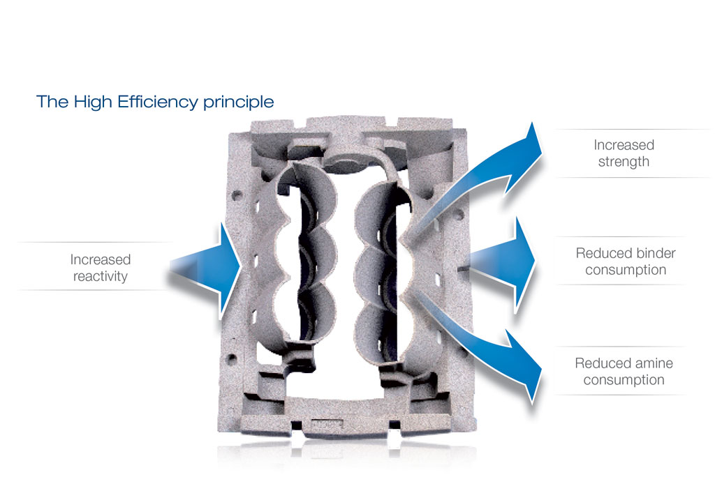 Technologically advanced binder systems make  an important contribution to reducing emissions and saving energy. This new generation of low-emission cold box binders offers high reactivity and productivity, with a significant reduction in the amount of binding agents and catalysts used. The low admixture  quantities required for the HE binder system mean significantly lower emissions and lower costs. The HE system is compatible with all catalysts and sand additives, in particular the mineral additives, which enable the emissions and disagreeable odors generated during pouring to be reduced further.