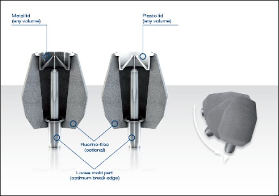 In addition, the volume can be varied in several ways, which ensures numerous application options. And, last but not least, the production process and the sealing lid contribute greatly to reducing the overall cost of the system considerably. At the same time, they offer the advantage of light risers with high process reliability, and efficient feeding as part of the casting process. A strong combination that is both efficient and attractive for foundries (figure 1).