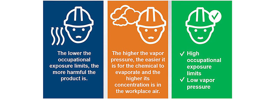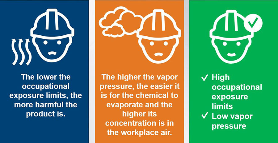 For occupational health and safety, it is therefore always better to use chemicals with the highest OEL – or ideally chemicals that require no OEL – and the lowest vapor pressure.