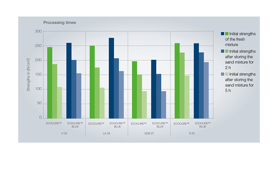 The new technology platform ECOCURE BLUE can be used with all common sand qualities (quartz, special sands and reclaimed sands) and is compatible with numerous sand additives (organic, inorganic or hybrid additives).