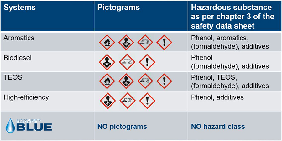 The first product of the new technology platform ECOCURE BLUE 30 HE1/ECOCURE BLUE 60 HE 1 achieves the good technical performance of ECOCURE 30 HE 1 LF/ECOCURE 60 HE 1 LF (2nd generation high-efficiency system), which is known to be the best non-aromatic system on the market and is used in nearly all Europen countries for iron applications.