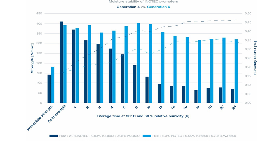 The 6th generation of INOTEC promoters improves the moisture stability of inorganic-bound sand cores as a key performance characteristic of the solid binder system component. The moisture stability of inorganically bonded sand cores can be monitored by determining the strength and moisture content during core storage at high absolute humidity. Measuring the moisture at 600 °C is necessary in order to record the sum of absorbed water in the sand core. Figure 1 shows the development of the two parameters "Strength" (bars and left scale) and "Humidity 600 °C" (dashed lines and right scale) of promoter formulations of the 4th and 6th generation as a function of storage time at an absolute humidity of approx. 18 g water/m3 air (30 °C, 60 % relative humidity).