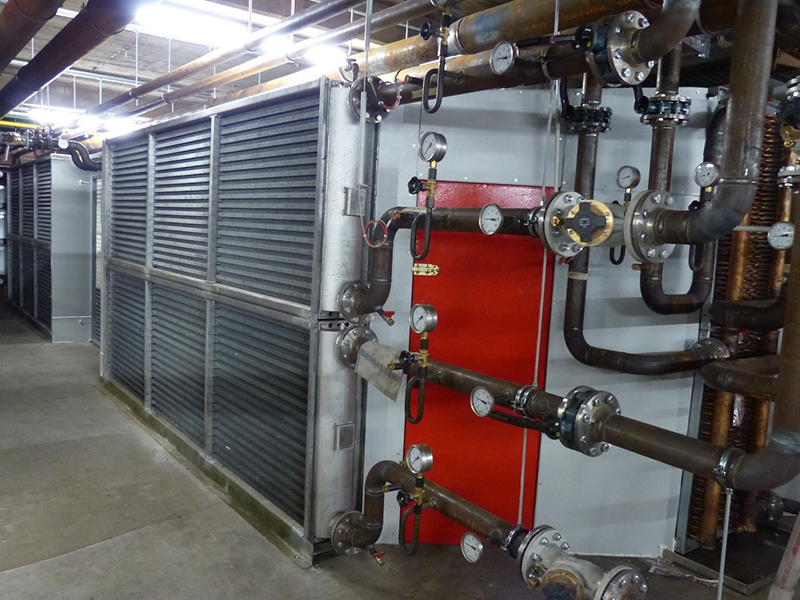 The heat transfer medium circuit leads to the basement below the foundry hall. The central supply air system for supplying fresh air to the foundry is located here. Fans draw in fresh air from outside. Via a first heat exchanger (Fig. 3), the energy recovered from the exhaust air is transferred to the supply air by means of a cycle compound system. In this way, the supply air can be heated to at least 11 °C even on cold winter days. In order to bring the supply air to the required inlet temperature of 18 °C, the system has a second heat exchanger stage (Fig. 4). Here, the energy supply is provided by integration into the cooling water circuit of the casting machines. The cooling water is normally discharged via a cooling tower. With a temperature of approx. 30 °C, it is an ideal carrier medium for the second heat exchanger stage during the cold season and thus heats the hall air to the required 18 °C. Every hour, 236,000 m³ of heated fresh air is fed into the hall via ventilation slots in the hall floor.