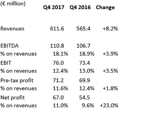 In Q4 2017 alone, consolidated revenues amounted to €611.6 million, up by 8.2% compared to Q4 2016.