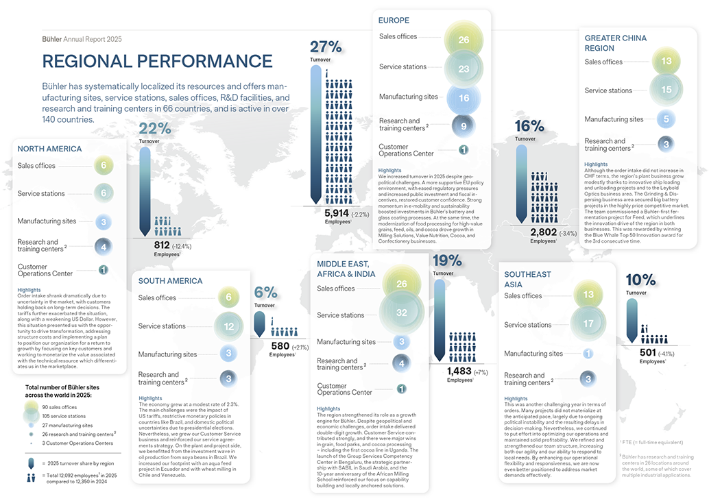 Bühler's global presence and network remained stable, with a few regional shifts. In the USA, orders declined by 31% as customers were unsettled by the tariff issue and postponed their investments in equipment and solutions. The strongest sales growth came from Africa, which became the largest region for Bühler's food and feed business for the first time. The continued strength of the Middle East, Africa and India region – with particularly high growth in Africa and the Middle East – partially offset the weaker performance in America and Asia.
