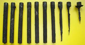 Wie sich das <link _top>Auflösen der Warmarbeitsstahlproben in einer <link _top>Aluminiumschmelze prinzipiell darstellt, zeigt Abb. 10. Während einer <link _top>Versuchsdauer von 32 Stunden, wurden die Proben mit Hilfe des <link _top>Rührwerks in der <link _top>Aluminiumschmelze bewegt und nach unterschiedlichen Zeiten jeweils eine Probe entnommen.