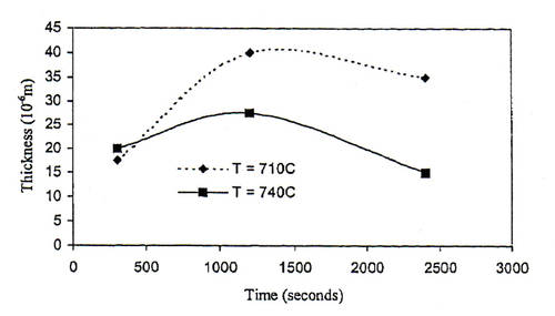 Die Entwicklung der sich bildenden intermetallischen Schicht während eines chemischen Angriffs durch eine flüssige <link _top>Aluminiumlegierung auf einen <link _top>Warmarbeitsstahl zeigt Abb. 1, wobei die Schichtdicke in Abhängigkeit der Zeit für 2 <link _top>Schmelztemperaturen dargestellt ist. Die Kurven ergeben sich hierbei aus zwei miteinander im Wettbewerb stehenden Mechanismen:
