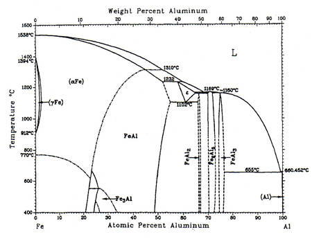 Das bevorzugte Auftreten der Fe2Al5-Phase kann durch den <link _top>orthorhombischen Aufbau mit einer abnorm hohen Leerstellenkonzentration erklärt werden, wodurch diese Phase nach deren Bildung besonders rasch durch <link _top>Diffusion wachsen kann. Ein solch rasches Wachstumsvermögen ist bei anderen intermetallischen Phasen entsprechend dem binären <link _top>Phasendiagramm Fe-Al nicht gegeben [5].