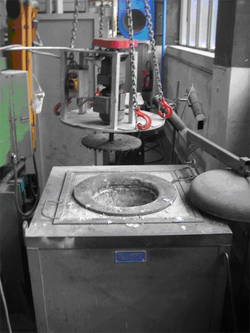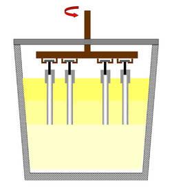 Mit Hilfe eines <link _top>Rührwerkes (siehe Abb. 4 und 5) wurden die Warmarbeitsstahlproben (Ø 20mm, Länge 200mm) zur Untersuchung des Auflösungsverhaltens (Korrosion) und des Klebeverhaltens (Soldering, Ausbildung intermetallischer Phasen) in jeweils 140kg flüssige <link _top>Aluminiumschmelze bei einer konstanten Temperatur von 750°C getaucht.