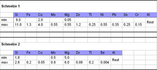 Als Testschmelzen für die Versuche wurden die <link _top>Aluminiumlegierungen 226 (<link _top>Schmelze 1) und eine Sonderschmelze (<link _top>Schmelze 2) herangezogen. Die <link _top>Aluminiumlegierung 226 (AlSi9Cu3(Fe)) ist aufgrund des guten Fließ- und Formfüllungsvermögens bei guten mechanischen Eigenschaften die meistverwendete <link _top>Aluminium-Druckgusslegierung.