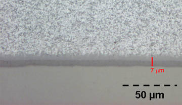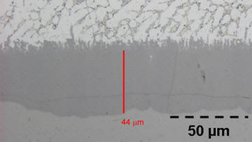 Wie in Abb. 6 und 7 ersichtlich, ruft die <link _top>Aluminiumlegierung <link _top>Schmelze 2 eine wesentlich ausgeprägtere Bildung der intermetallische Phase Fe2Al5 hervor. Darüber hinaus ist in den lichtmikroskopischen Aufnahmen das <link _top>Auflösen des <link _top>Warmarbeitsstahls besonders in Abb. 6 deutlich zu erkennen, wodurch es zur Ausbildung einer welligen <link _top>Grenzfläche zwischen <link _top>Stahl und intermetallische Phase kommt.