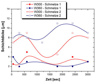 Den zeitlichen Verlauf der Dicke der sich ausbildenden intermetallischen Schicht der <link _top>Warmarbeitsstähle W300 und W360 in den beiden <link _top>Aluminiumschmelzen zeigt Abb. 8. Es ist für alle Versuche eine Zu- und Abnahme der Schichtdicke zu erkennen, die sich, wie bereits beschrieben, aus dem Bildungs- und Wiederauflösungsprozess ergibt.