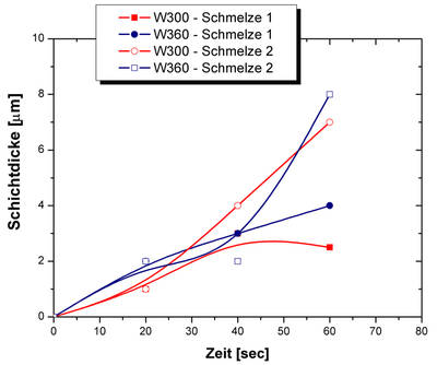 Da die flüssige <link _top>Aluminiumschmelze in der <link _top>Gießkammer verweilt, bevor sie in die Druckgussform gepresst wird, sind vor allem Untersuchungen zum Klebeverhalten für einen kurzen Zeitbereich interessant. In Abb. 9 ist die Entwicklung der intermetallischen Schichten für kurze Reaktionszeiten für die beiden <link _top>Schmelzen gezeigt. Hieraus ist erkennbar, dass 5%-ige <link _top>Chromstähle tendenziell ein sehr ähnliches Klebeverhalten (Soldering) aufweisen. Bei diesen kurzen Versuchszeiten unterscheiden sich die Dicken der gebildeten Schichten kaum, doch scheint aufgrund der starken Steigung der Kurven für die <link _top>Schmelze 2 nach 60 Sekunden das Schichtwachstum noch keineswegs abgeschlossen zu sein.<break>