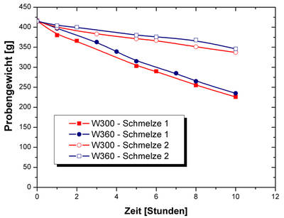 Bei der Untersuchung der eintretenden Masseverluste der Warmarbeitsstahlsorten in flüssigen <link _top>Aluminiumschmelzen wurden die gewählten Werkstoffe in 140 kg <link _top>Aluminiumschmelze (<link _top>Schmelze 1 und 2) bei 750°C getaucht und Proben nach unterschiedlichen Zeitsequenzen entnommen.