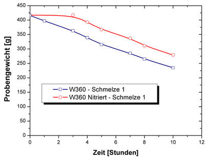 Wie ersichtlich, bewirkt die Nitrierschicht eine Verzögerung des <link _top>Auflösens von ca. 3 Stunden unter den genannten Versuchsbedingungen. Sobald die Nitrierschicht aber aufgelöst ist, zeigt sich dieselbe Auflösungskinetik wie bei nichtnitrierten Proben. Dies gilt tendenziell für alle im Rahmen dieser Arbeit durchgeführten Versuchskombinationen.