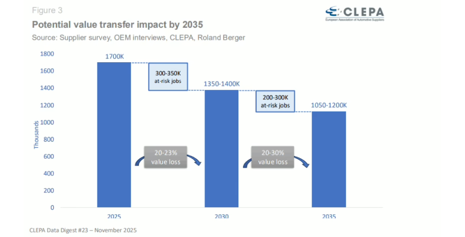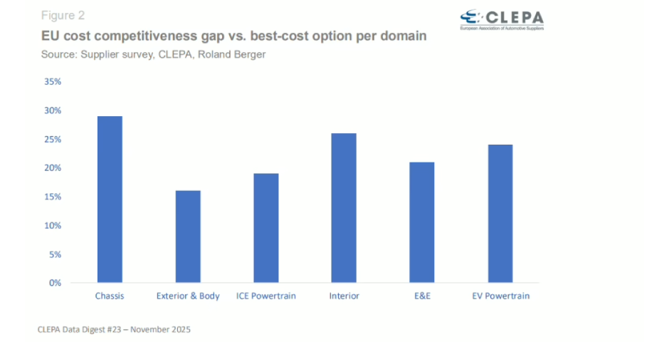 Europe currently faces up to a 35% cost disadvantage compared to other regions, driven by rising material, energy, and labour costs, along with stricter regulatory and carbon regimes. If left unaddressed, this could reduce value creation in car parts by 23% and put 350,000 jobs at risk by 2030.