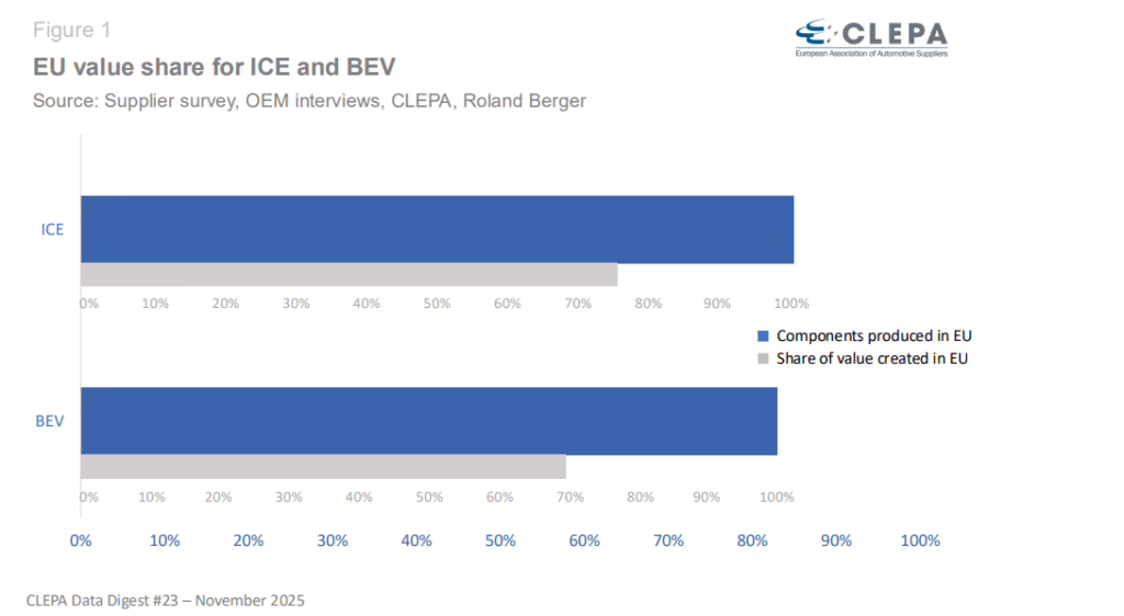 - BEV/electronics supply chain dependencies push EU value share down
