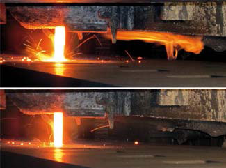 A continuous blasting system is located downstream of the cooling drum integrated in the production process. This facility features automatic material flow monitoring, which allows the blasting abrasive throughput to be adjusted. A round grain of low-carbon cast steel is used as a blasting abrasive.