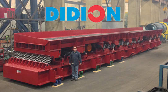 DIDION International Inc. recently installed an 8' wide x 32’ long) vibratory shakeout and a (8’ wide x 36’ long) vibratory Feed / Sorting conveyor both built by Conveyor Dynamics weighing 125 tons. Up to 10 ton Chemically-bonded molds are shaken out and the large iron castings are removed by two large manipulators. The sand is then fed into a DIDION® Rotary Lump Crusher / Sand Reclaimer rated at 80 tons/hour, the largest in the world.