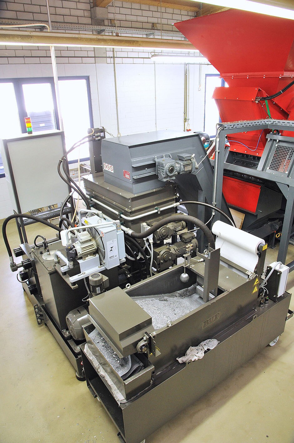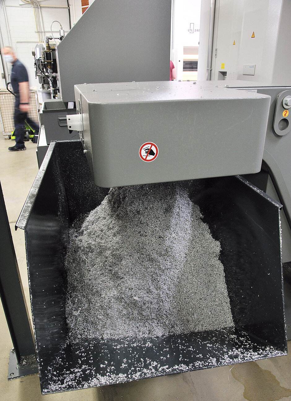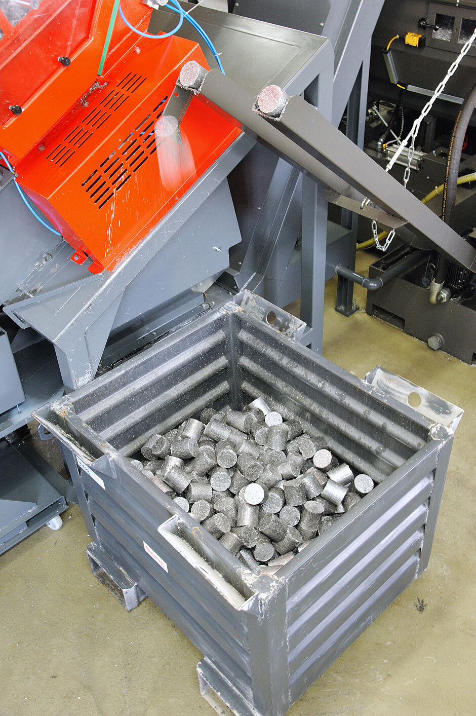 Each machining center at Euler is equipped with roll-mounted chip collection containers. When they are full, a machine operator pushes them to the chip processing plant, where an empty container awaits. The operator removes the full container from the lifting device and pushes it in, initiating the process with the push of a button. The operator can immediately return to work with the empty 400-liter container without further involvement in the briquetting process. The container is automatically lifted about three meters in height and emptied into the shredder. The shredder breaks down long continuous chips and nests of chips, removing any potential foreign objects via a coarse-part outlet. The crushed chips are then transferred via a hinged belt to the press's funnel, equipped with a fill level sensor. The system starts automatically when the funnel is full and stops when all chips are briquetted. The RUF 11/4000/70 compresses the chips with its 11 kW powerful motor and a pressing pressure of up to 4000 kg/cm2, producing round briquettes with a diameter of 70 mm and a length of approximately 70 mm. The density of the briquettes is about 2.3 kg/l, not far from the raw density of solid aluminum, which is 2.7 kg/l. Simultaneously, the adhering cutting fluid is practically completely squeezed out and collected separately. The finished aluminum briquettes fall into a collection container, holding about one cubic meter.