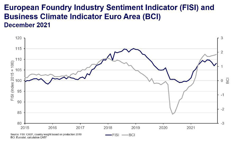 account. The European Foundry Sentiment Indicator (FISI) nevertheless improved by 1.1 points to the new index value of 108.1. Exploding infection figures in Europe and on the globe are a cause of concern for the industry again. In addition to the direct impact on the production facilities, further disruptions in the global supply chains and associated cost increases and availability problems for primary materials are to be expected. While this also offers European foundries great business opportunities, as the demand for castings is sufficient especially in mechanical engineering, the enormous energy costs continue to burden the entire industry. Although the urgency of the situation has been recognised by politicians, quick and effective solutions are difficult to find due to geopolitical tensions and international dependencies on energy markets.