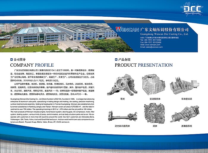 Guangdong Wencan Die Casting Co. Ltd (Stock Number is 832154), founded in 1998, is a large manufacturing enterprise of aluminum auto parts, specializing in tooling design and making die casting, precision machining, surface treatment and assembly. Setting its headquarter in Foshan Guangdong, Wencan also established wholly-owned subsidiaries in Nantong Jiangsu and Tianjin. Wencan covers an area of 270.000 m2, and the total investment is over 750 million. The operating incoming in 2015 is 1.170 million and the net profit is 150 million. The main products of Wencan includes engine, transmission system, steering gear, AC compressor, motor, filter system, braking system, various kinds of pump, control module, and car body structure parts and so on. We cooperate with customers in more than 20 countries around the world. Our tier1 customers are Mercedes-Benz, Volkswagen, GM Tesla, Volvo, Audi and Great Wall and so on. And our world well-known auto components customer are Bosch, Thyssen Krupp, Mahle, Valeo, Brose, ZF, HVCC and so on.