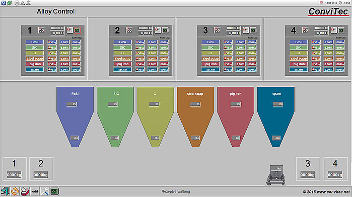 The scope of delivery of the charging plant comprises a group of 6 bunkers with ultrasound filling level sensors, having a magnetic feeder and discharge flap each. Underneath there are two mobile weighing devices with containers for the charging batch. Two precision laser distance sensors with SSI interface ensure precise positioning under the bunkers.