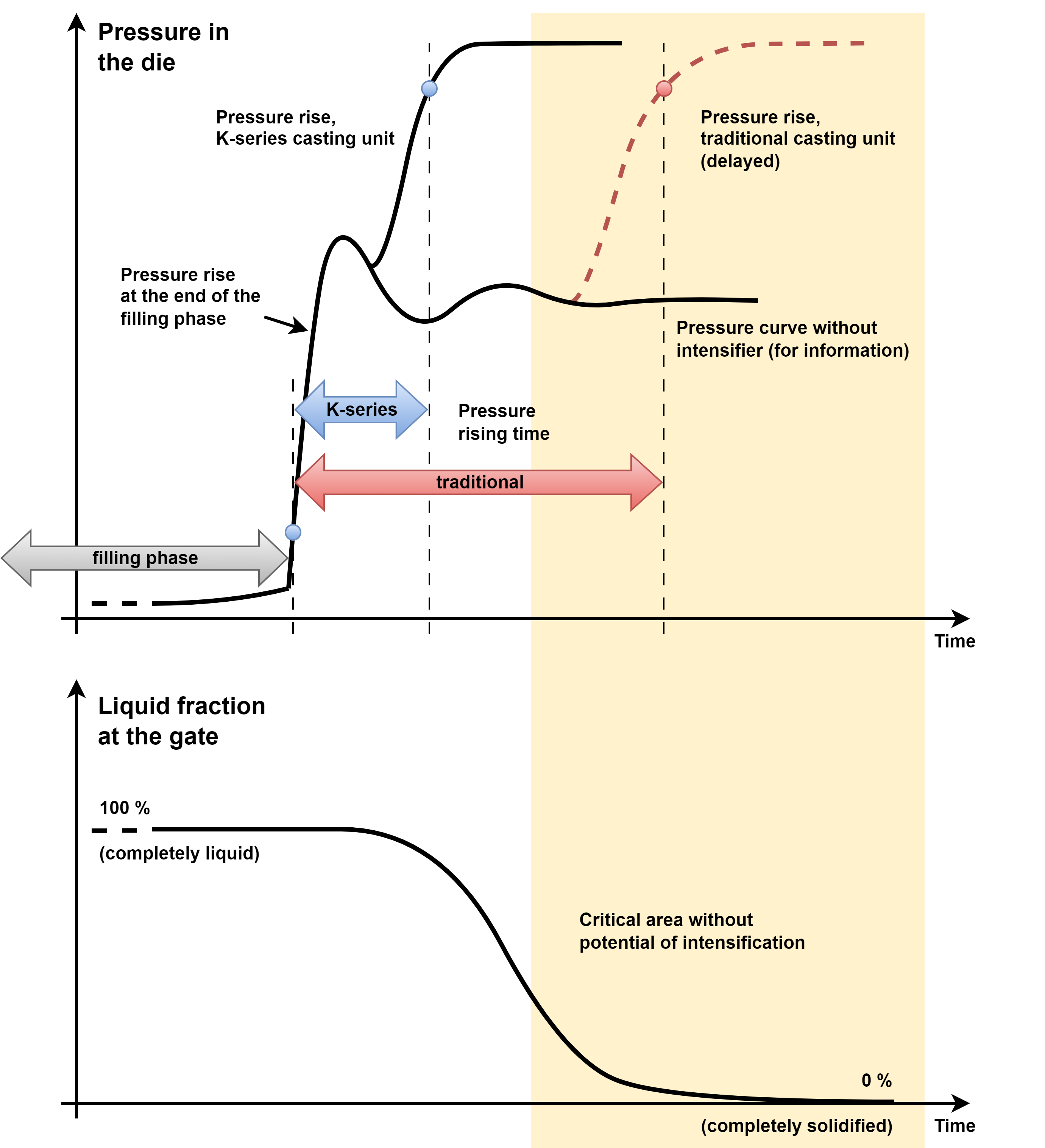In conventional casting units, pressure rise takes 30 to 50 milliseconds, measured from completion of die filling to when around 90% of the compression level has been achieved. With a filling time of 30 milliseconds, the pressure build-up time is roughly the same or even longer – and is thus comparatively high. It is made up of an idle time and the actual pressure rise time. The idle time occurs because, in conventional casting units, the central, spring-actuated check valve has to fully close before the intensifier plunger can increase the pressure. During this idle time of approximately 15 to 25 milliseconds – even longer than 40 milliseconds in the case of large machines – pressure in the die is not increased.