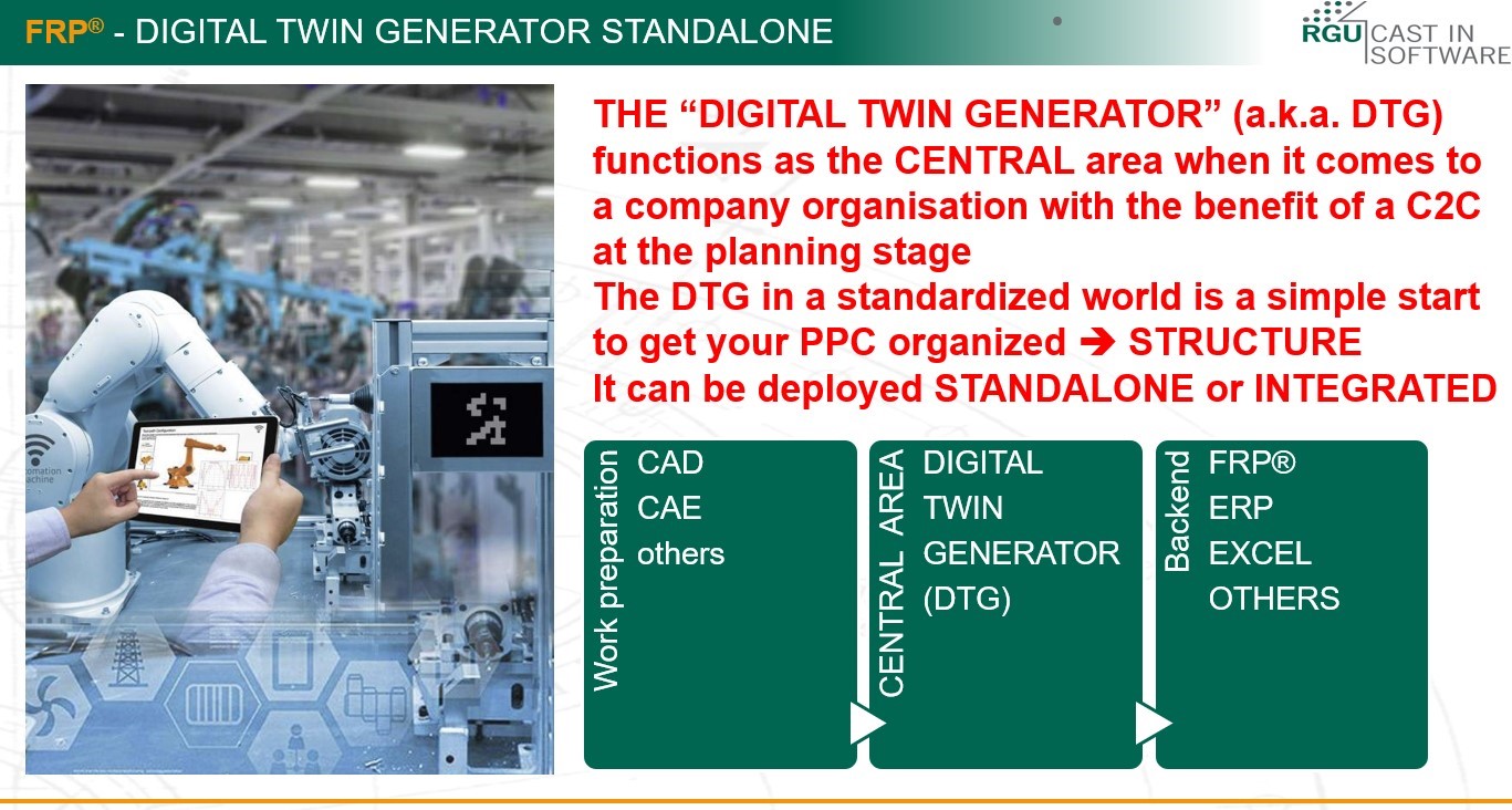 - FRP®.DTG can generate the complete digital twin (i.e. the FRP® - Resource Plan = BOM + Workplan + Manpower plan + Materials + Purchase Items + Machinery plan + Timings + any other Master Data) through a few easily accessible information fields (or even automatically obtained from CAD / simulation solutions) and data entry within MINUTES!