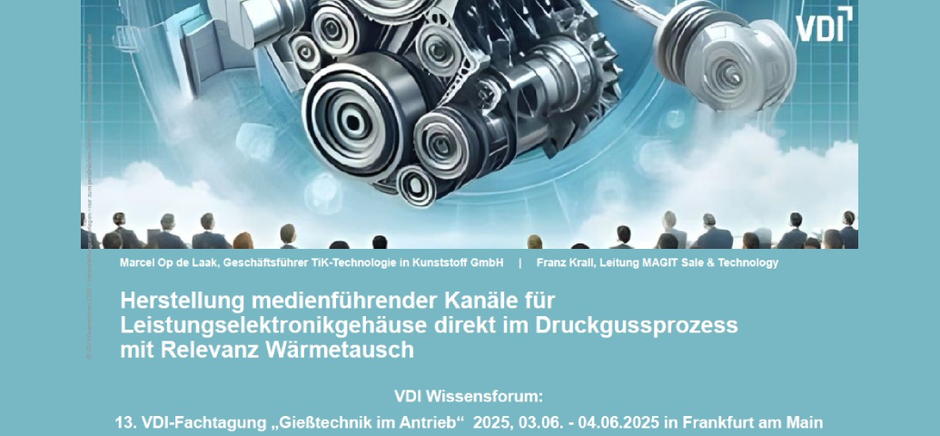 The white paper includes the presentation "Manufacturing media-carrying channels for power electronics housings directly in the die casting process with relevance to heat exchange" by Marcel Op de Laak, Managing Director of TiK-Technologie im Kunststoff GmbH, and Franz Krall, Head of MAGIT Sales & Technology. This was presented at the VDI symposium "Casting Technology in Drive Systems."