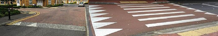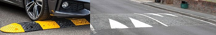 A larger relation to the others is the Speed Table, which can also include a crossing known descripitviely as a Raised Pedestrian Crossing. These designs extend the top of the hump considerably, allowing enough space for the crossing to potentially sit on top of it while still forcing drivers to slow down when both entering and exiting. They vary in size significantly and can often encompasse entire junctions.