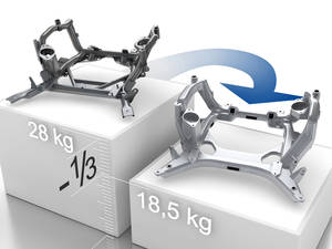 The weight-saving structural elements of light metal have been developed by Honsel especially for use in the chassis. They are incorporated in the sub-structure to replace conventional heavy steel parts, e.g. as engine supports or axle-suspension elements. Special design and production processes geared to the material characteristics of light metal ensure that the strength of these components is very high. For example, Honsel's rearaxle support in the Volvo V 70 4WD saves about one third of the original weight, and weighs only 23.5 kg. And as a structural component, the Peugeot 407 engine support is a real featherweight at only 15.5 kg. The change to lightweight technology is also interesting from an economic point of view. Support structures made of steel have to be assembled from several different parts. This costs money, not to mention the expensive anti-corrosion treatment of the surface. Light-metal engine and axle supports on the other hand can be produced more economically as single castings. They only need machining at the junction and control points. Currently, Honsel is developing advanced chassis components which can assume vital impact-absorbing functions in the vehicle crush zone. To make this possible, Honsel's engineers are optimising the deformation behaviour of the structures concerned. For example, they are working on highly ductile castings which show excellent plastic deformation in crash tests. In addition, they are also creating structural parts consisting of cast elements and extrusions which collapse easily under crash conditions, thereby absorbing much of the energy of the impact. Not only axle supports, but the wheel suspension itself offers considerable potential for making cars lighter and improving dynamic characteristics.