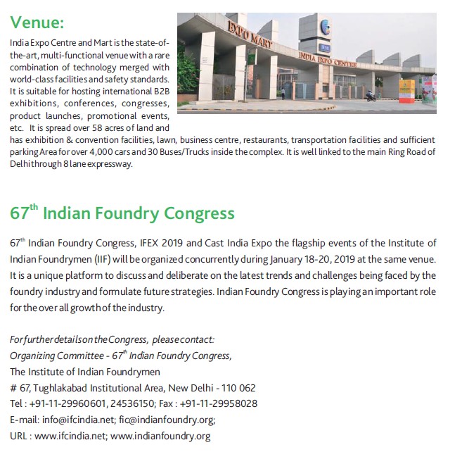 The only trade fair in India, which is rapidly becoming one of the important casting sourcing destinations in Asia - Cast India Expo will be organized concurrent to IFEX 2019 and 67 Indian Foundry Congress. th This is an excellent platform for the foundries from all across India to display their capacities and capabilities to the buyers comingfromacross the globe.