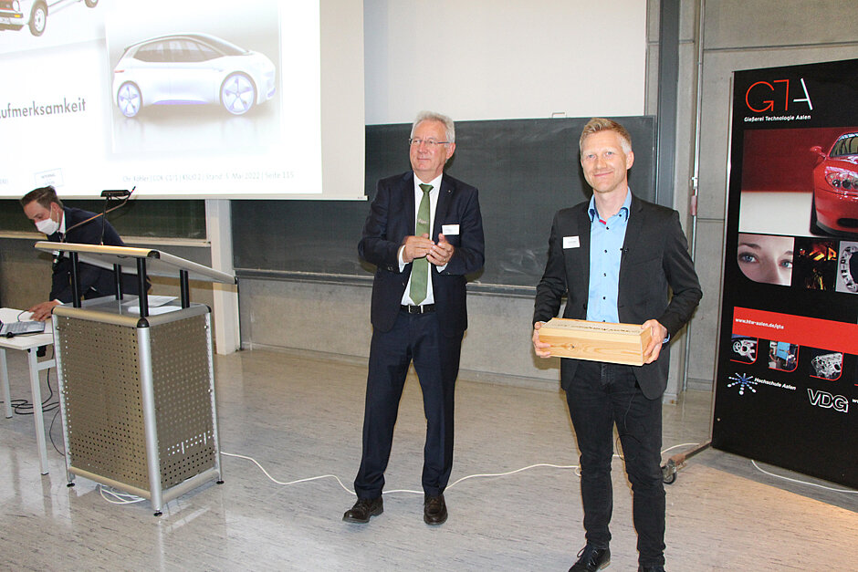 Dipl.-Ing. Christoph Schendera of EFM e.V. presented the winners of the Magnesium Award, which was supported by the German Foundry Industry Association (BDG), the German Aluminium Industry Association (GDA) and the European Research Association for Magnesium (EFM): Third place went to Dynacast for a painting unit for a coffee machine. The component was made of magnesium instead of plastic. Torun Bark Magnesium GmbH was runner-up with its table top for a circular saw. GF Casting Solutions AG was the winner with a cross car beam. The integration of function and the utilization of the complete installation space were convincing here. Prof.-Dr. Lothar Kallien then presented the results in the zinc and aluminum die casting category. He first discussed the winners in the aluminum category. First place went to a one-piece upper shell of a rear axle beam made of die casting by Albert Handtmann GmbH. Second place was shared by Alupress AG and BMW Leichtmetallgießerei. Matthies Druckguss GmbH took third place with a housing with a 3D-printed mold core. The winners of the zinc category were then presented: First place went to Siegfried Müller GmbH for an assembly of 3 die cast parts, followed by a switch handle from HDO- Druckguss und Oberflächentechnik GmbH, and a clamping plate from Teilemacherei GmbH.