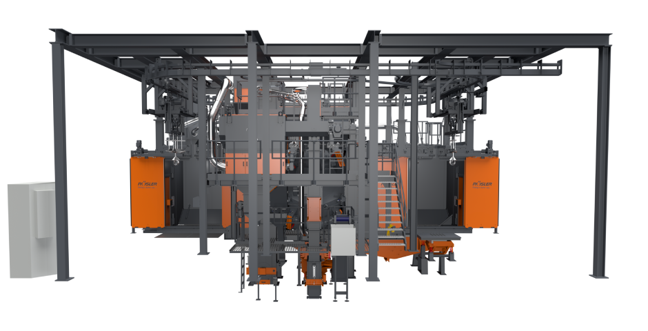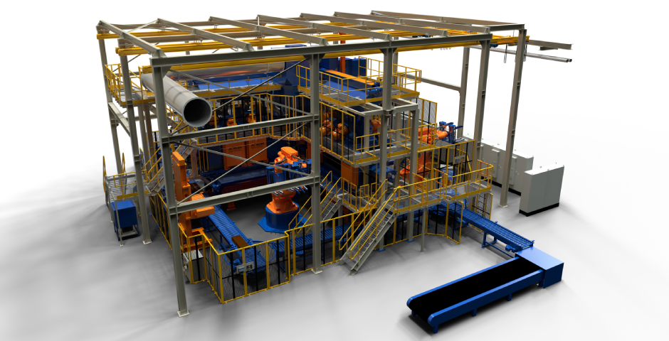 Shot blasting of engine blocks, weighing 700 kg, within 50 second cycle times