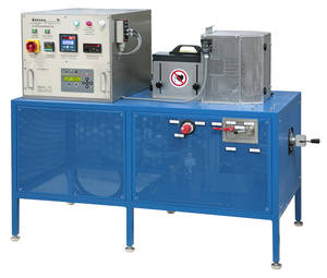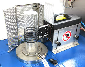 High frequency crucible furnace with vacuum for induction melting of metals and metal alloys, for heat treatment and for sintering of oxide ceramics and powder metals. Operation with and without vacuum possible. It is possible to use different coils for the application, which are individually height-adjustable, to ensure a high flexibility for the application processes. Control unit for automatically control of heat power, gas flow and to regulate the temperature.